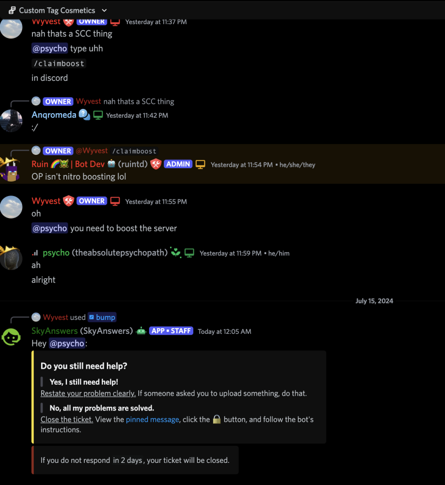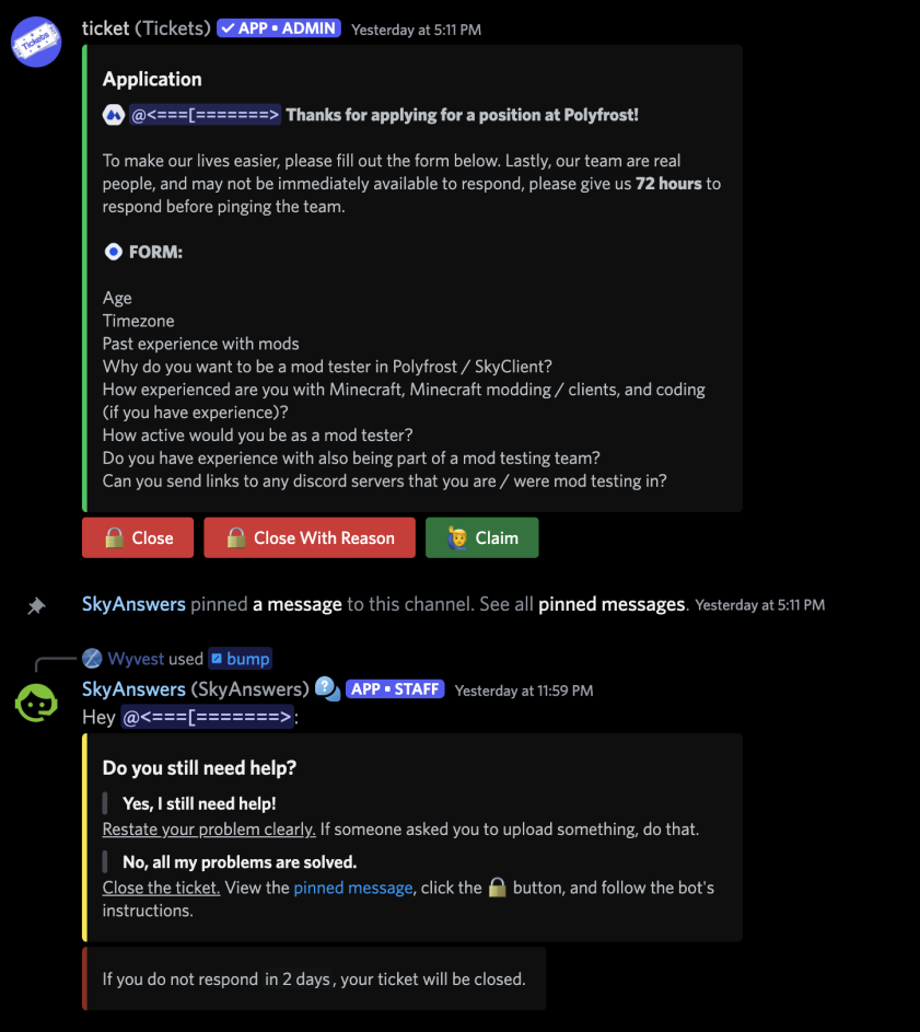 If you see any form of someone asking for help in general in SkyClient or Polyfrost, immediately tell them to go to the support channel and make a ticket.